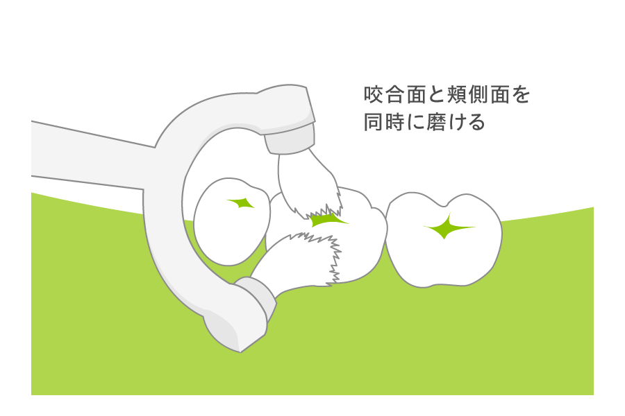 ・頬側に回転させると咬合面と頬側面を同時に磨くことができます。