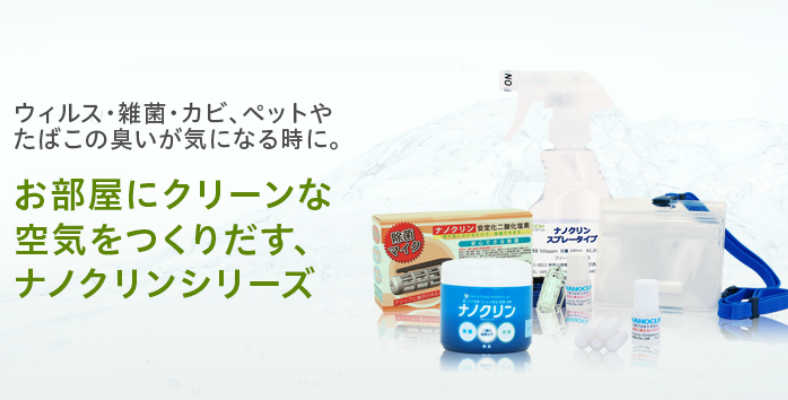 ナノクリンの成分、安定化二酸化塩素は強力な除菌力・消臭力を実現します。ナノクリンは細菌、カビ、ペットやタバコの臭いのもとを素早く除菌する効力を持続させるため、二酸化塩素をそのままゲル化したものです。強力な除菌力・消臭力・即効性が特徴。インフルエンザ・ノロウイルス・O-157等の予防にも適しています。