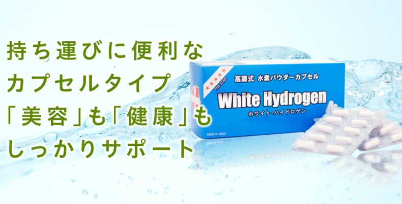 高藤式水素パウダーカプセル ホワイトハイドロゲンは1日2粒の摂取で簡単に水素の補給が可能です。 お腹の中で初めて水素を発生するため、新鮮な高濃度1,518ppbもの水素を吸収することが可能です。 美容では、うるおいがほしい方、むくみが気になる方、ハリとツヤがほしい方、若々しい毎日を送りたい方におすすめ。 健康面では、偏頭痛持ちの方、肩こりが続く方、疲れやすい方、健やかな毎日を送りたい方におすすめです。
